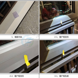 推拉門門框污染,廚房櫥柜門大小頭,灶臺下面配件松動,客廳墻面幾處出空鼓,墻面有細微裂紋,1個窗戶框變形,幾處瓷磚空鼓,全屋墻面多處刮花等,累計約29處質(zhì)量問題。